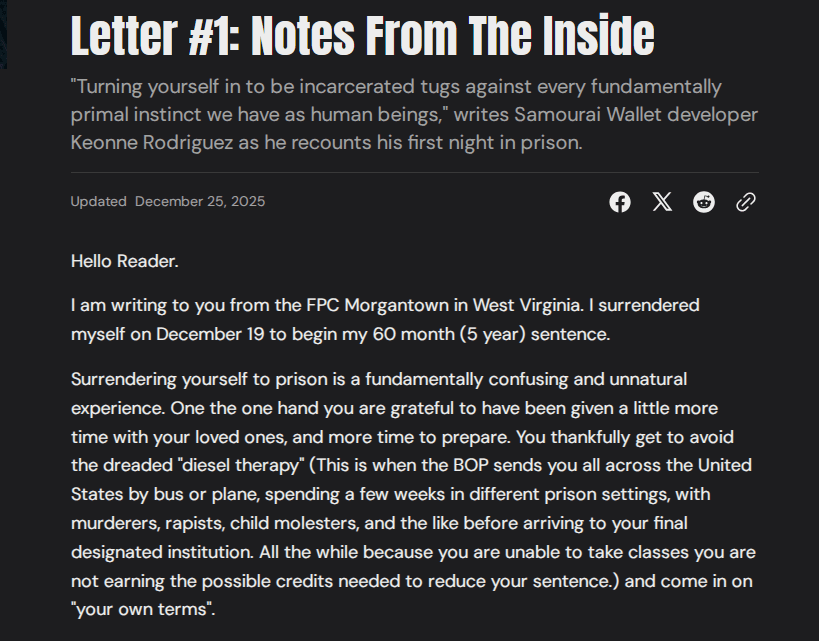 Keonne Rodriguez, a co-founder of the Bitcoin privacy tool Samourai Wallet, began serving a five-year sentence and wrote a letter from inside a US federal prison on Christmas Eve.